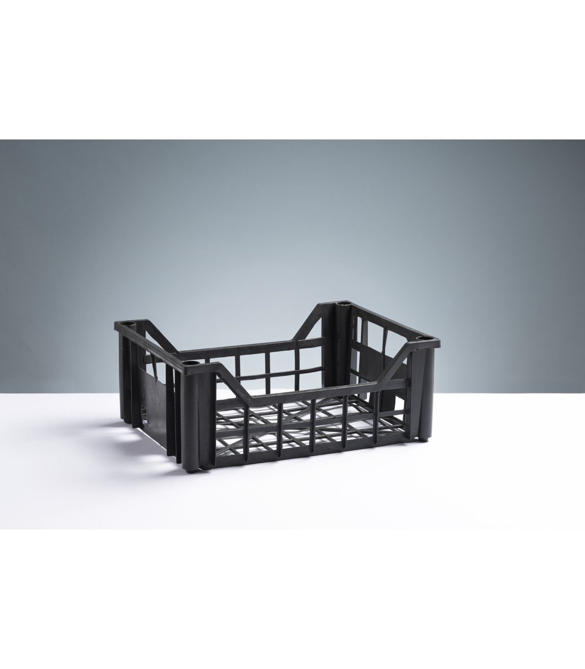 Cassetta in plastica riciclata, di medio formato, a maglia larga. Maneggevole e impilabile.