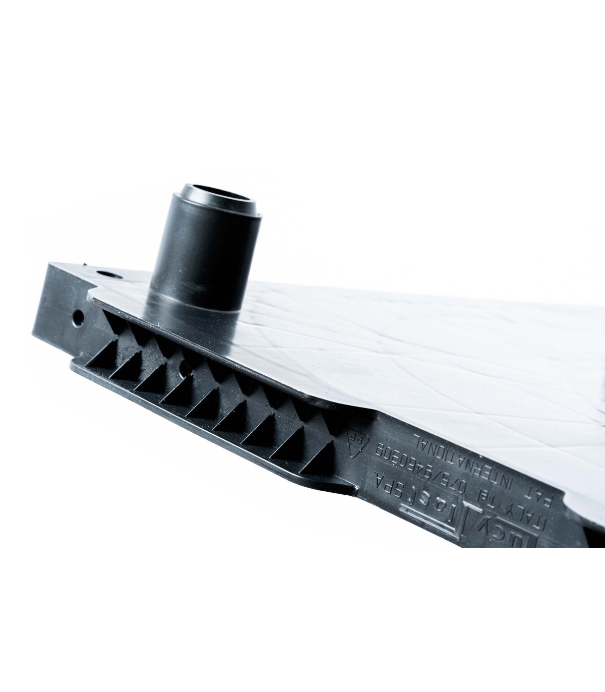 Qui nella versione con tappo cilindrico incorporato da 70mm, la flangia 580X600mm in R-PP monomateriale supporta bobine di medie dimensioni. La flangia è disponibile anche con tappo cilindrico incorporato di dimensioni 76mm.